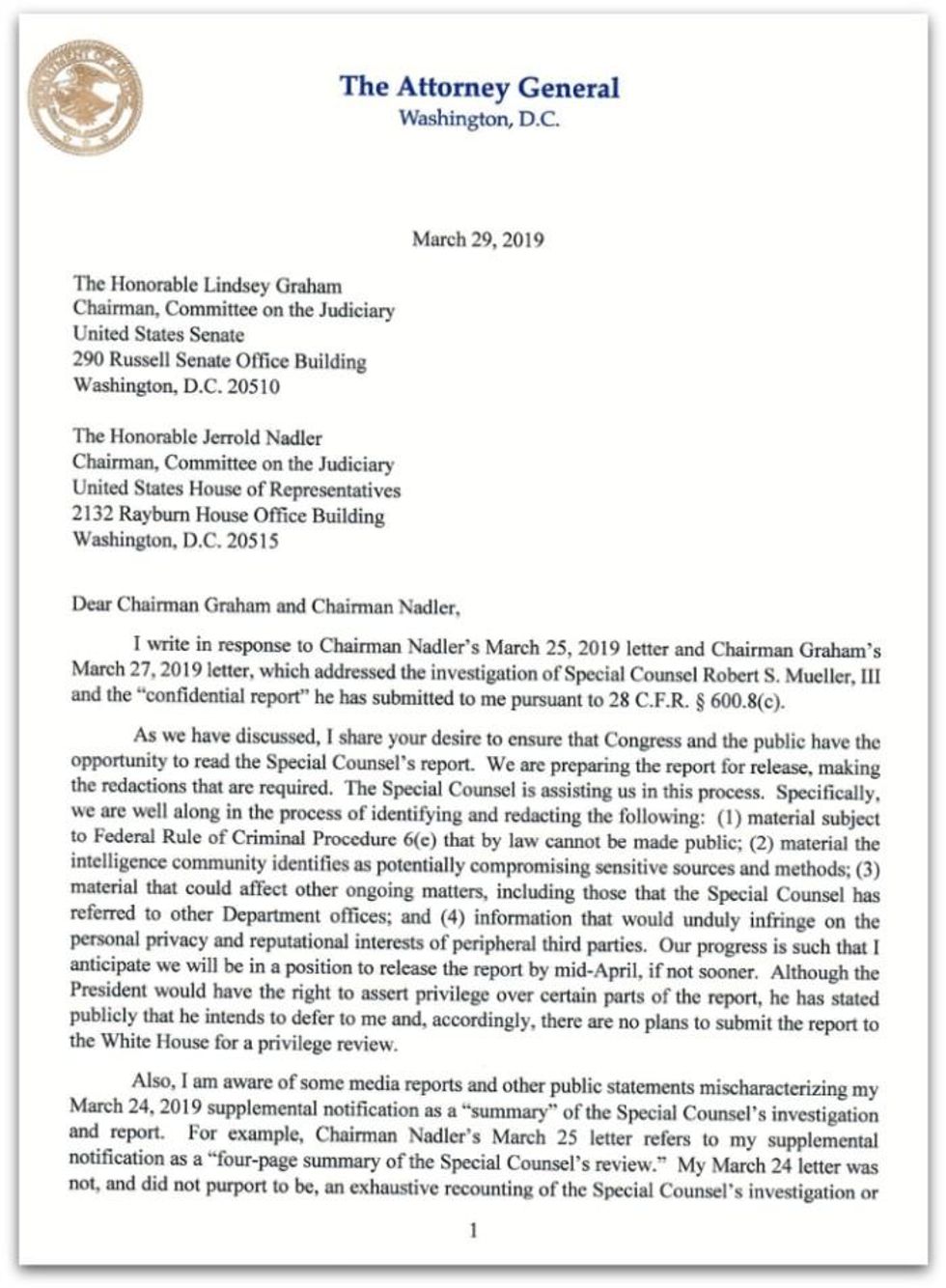 "There is ample precedent for the Department of Justice sharing all of the information that the Attorney General proposes to redact to the appropriate congressional committees," Nadler said. "Again, Congress must see the full report."