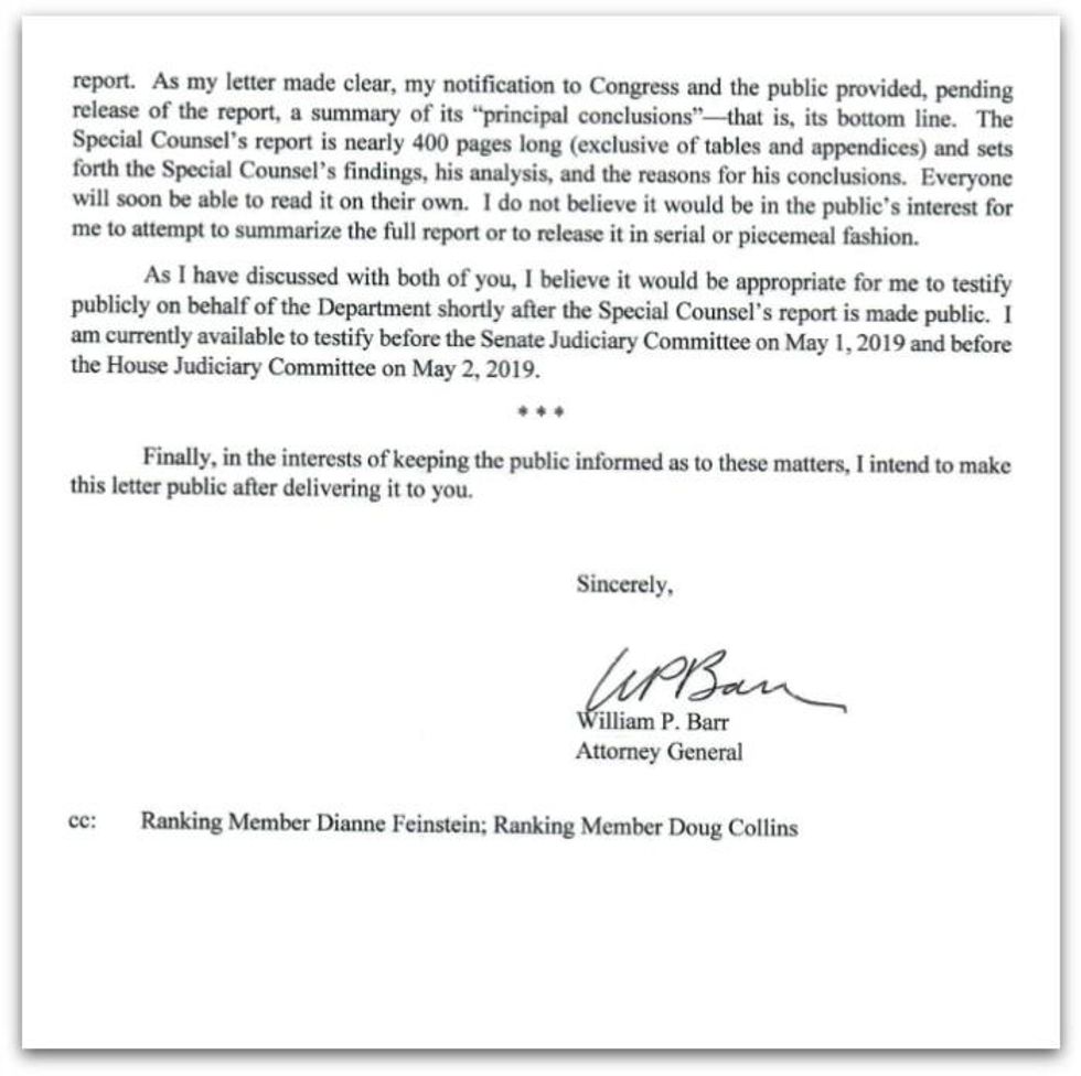 "Remarkably, Barr could have issued this exact letter along with his initial memo: noting the process by which he was working through matters, the length of Mueller's report, and clarification that his memo was not a summary," tweeted The Daily Beast's Sam Stein. "Instead, he waited days to send this. Curious."