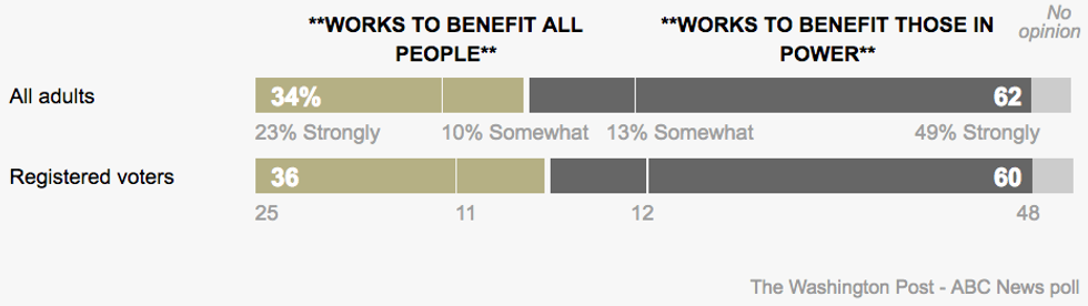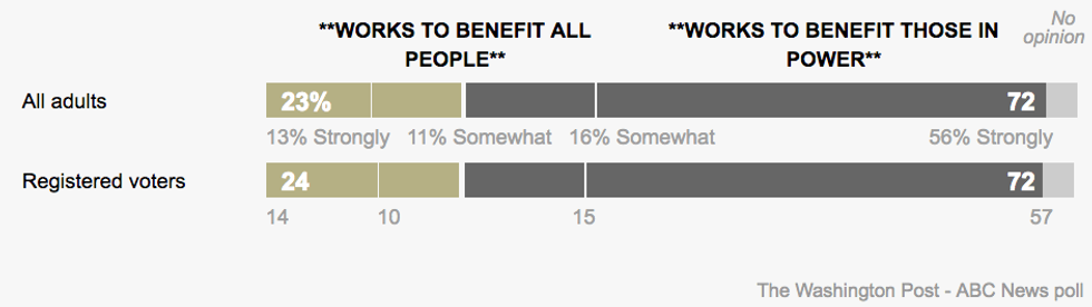 Most Americans also feel that the U.S. political system is skewed to reward the powerful--72 percent of U.S. adults believe the American political system "works to benefit those in power" rather than "all people," the Post/ABC survey found.