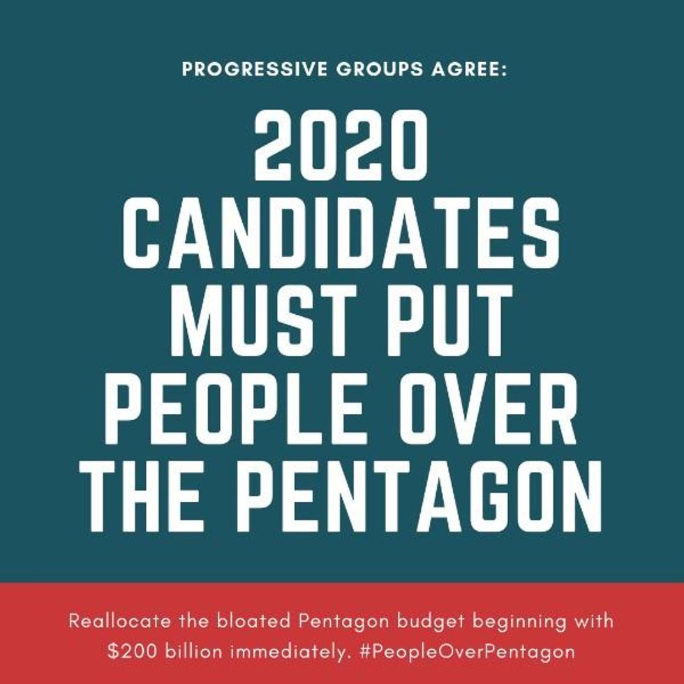 In an effort to rein in the bloated military-industrial complex and free up funds for "programs that nurture human lives rather than take them away," a coalition of nearly two dozen progressive advocacy groups on Thursday launched a campaign urging 2020 Democratic presidential candidates to support cutting the Pentagon budget by at least $200 billion per year.