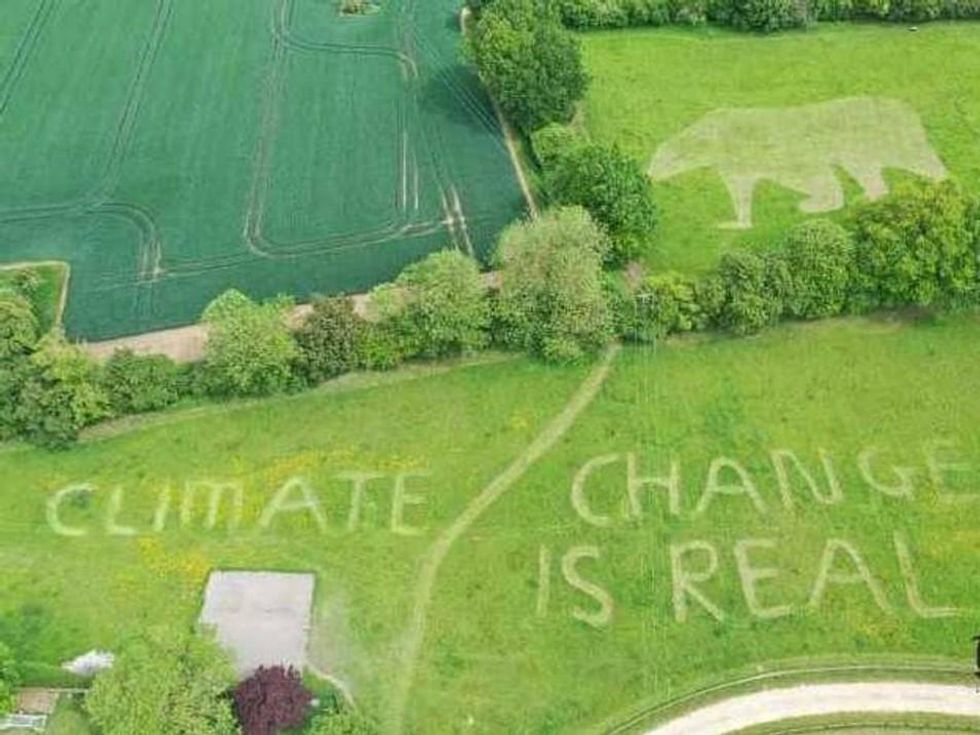 A student in the UK, 18-year-old, Ollie Nancarrow used a lawnmower to draw a giant penis, a large polar bear, and the message 'Climate Change Is Real' into his lawn near Stansted, the airport where President Donald Trump arrived on Monday. (Photo: Born Eco/Twitter)