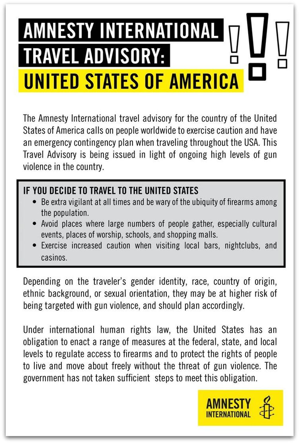 \u201cAmnesty International today issued a travel warning calling for travelers and visitors to the United States to exercise extreme caution due to rampant gun violence, which has become so prevalent in the US that it amounts to a human rights crisis. https://t.co/bsVsiBOO5K\u201d— Amnesty International USA (@Amnesty International USA) 1565205744