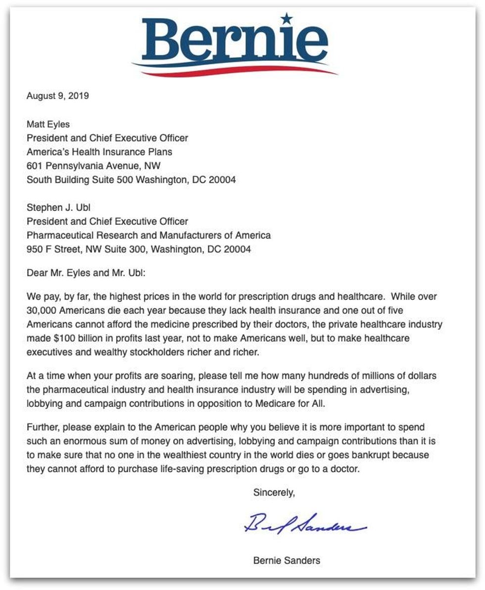 In a letter sent Friday to Matt Eyles and Stephen Ubl, the respective heads of America's Health Insurance Plans (AHIP) and the Pharmaceutical Research and Manufacturers of America (PhRMA), Sanders asked them both to "please explain to the American people why you believe it is more important to spend such an enormous sum of money on advertising, lobbying and campaign contributions than it is to make sure that no one in the wealthiest country in the world dies or goes bankrupt because they cannot afford to purchase life-saving prescription drugs or go to a doctor."