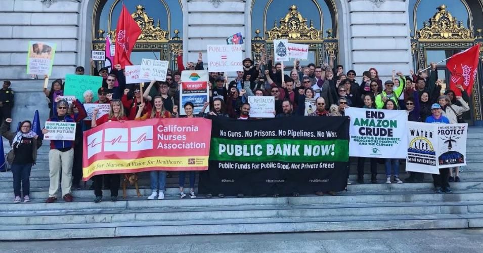 Members of the San Francisco Public Bank Coalition rally at San Francisco City Hall to demand the creation of a public bank. (Photo: Kurtis Wu)