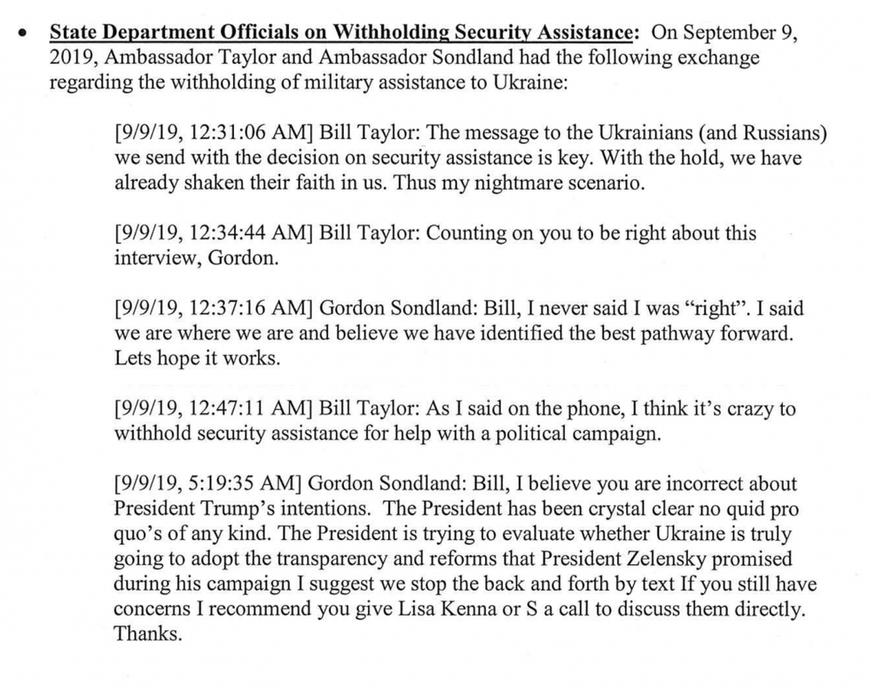 Eight days later, Taylor wrote to Volker and Sondland, "As I said on the phone, I think it's crazy to withhold security assistance for help with a political campaign."