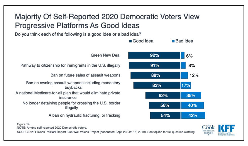 Despite frequent arguments to the contrary made by corporate Democrats, among the overall findings of the KFF/Cook analysis is that few Democratic voters in these four states currently see "progressive positions as deal breakers in their 2020 vote." In addition, a specific look at the Green New Deal shows a full 92% of self-identified Democratics back such a plan.