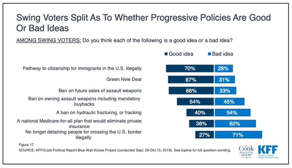 --Stephen O'Hanlon, Sunrise MovementThe survey (pdf) in question, conducted by the Kaiser Family Foundation in collaboration with the Cook Political Report, took a detailed look at both Democratic and swing voters in four key battleground states--Michigan, Minnesota, Pennsylvania, and Wisconsin--where President Donald Trump either beat Hillary Clinton in 2016 or outperformed expectations. While Clinton edged out her Republican rival in Minnesota, Trump claimed the other three--wins that many cite as pivotal for his overall victory.