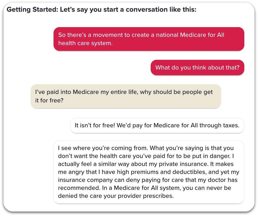 The online tool--available here--allows users to "encounter a combative friend or family member and be given options to respond." Starting with a prompt and then a set of possible responses, it walks through a hypothetical conversation, offering helpful talking points and facts along the way. For example: