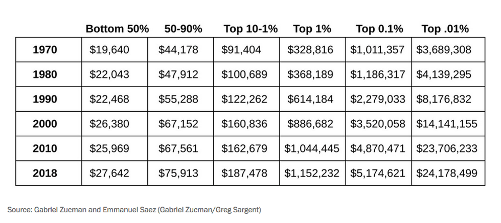 Zucman and fellow economist Emmanuel Saez, his co-author of the new book "The Triumph of Injustice," provided a chart showing how each group of earners' take-home pay has changed since 1970. The wealthiest Americans' assets skyrocketed by millions of dollars even in the first decade of the 21st century--when people in the bottom 50% saw their average take-home income decrease.
