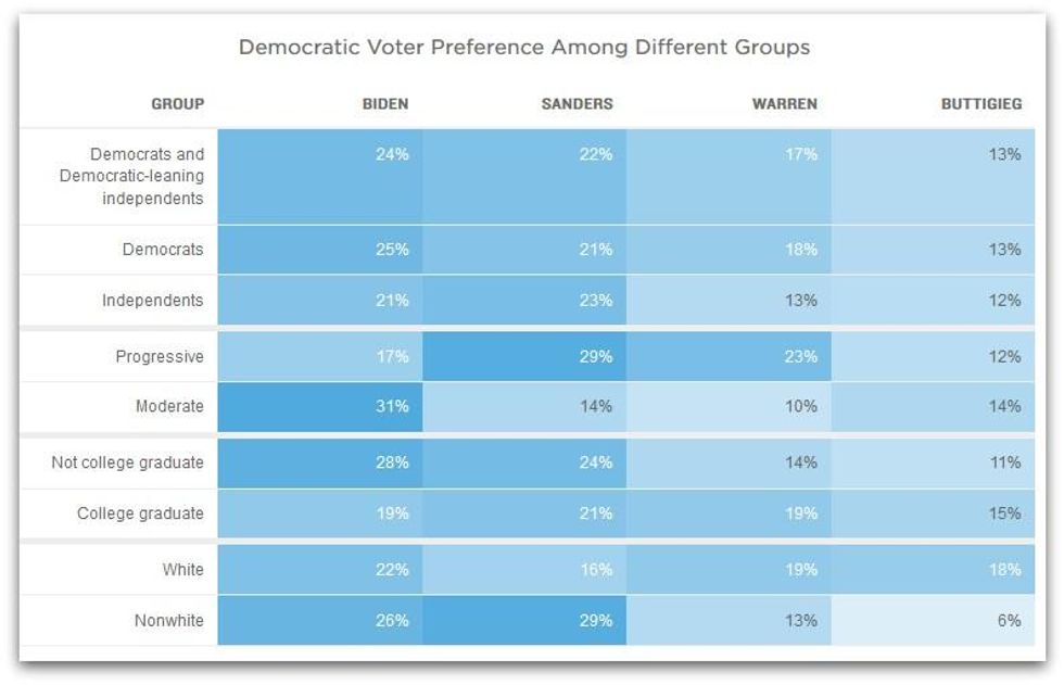 The NPR/PBS NewsHour/Marist survey (pdf) found that Biden is leading the race at 24% support, followed by Sanders at 22%, Sen. Elizabeth Warren (D-Mass.) at 17%, and South Bend, Indiana Mayor Pete Buttigieg at 13%. No other Democratic presidential candidate broke the 10% mark.