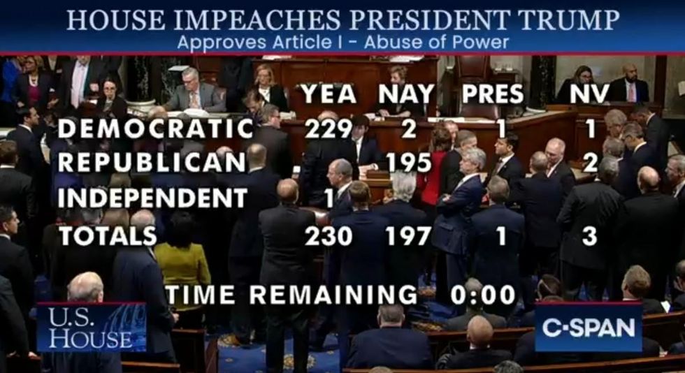 The final vote on the first article was 230 to 197, largely along partisan lines. One member did not vote. Not one Republican voted in favor, while just two Democrats--Rep. Jeff Van Drew of New Jersey and Rep. Collin Peterson of Minnesota--joined the GOP in voting against.