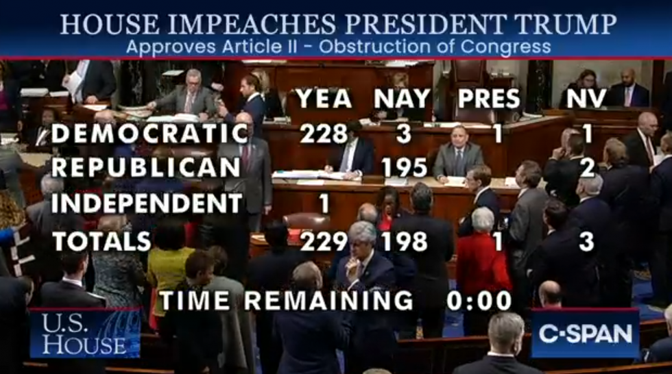 "Today, every single Republican in the House of Representatives became an accomplice to Trump's subversion of our democracy. By failing to impeach Donald Trump, GOP lawmakers showed their blind loyalty to their party and to a corrupt president--and history will remember them for the cowards they are." --Sean Eldridge, Stand Up AmericaThe U.S. House of Representatives on Wednesday night--for just the third time in the nation's history--impeached a sitting U.S. president.