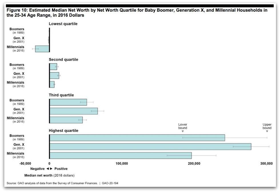 The Government Accountability Office report (pdf), obtained Wednesday by Teen Vogue, found that millennials between the ages of 25 and 37 have substantially less wealth, lower homeownership rates, and fewer retirement resources than Generation X and the Baby Boomers.