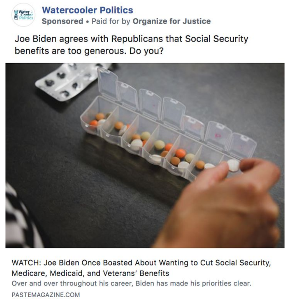 In the ad focusing on Social Security, Organize for Justice writes that Biden agrees with Republicans that the benefits "are too generous," referring to comments the former vice president has made for four decades and as recently as 2014.