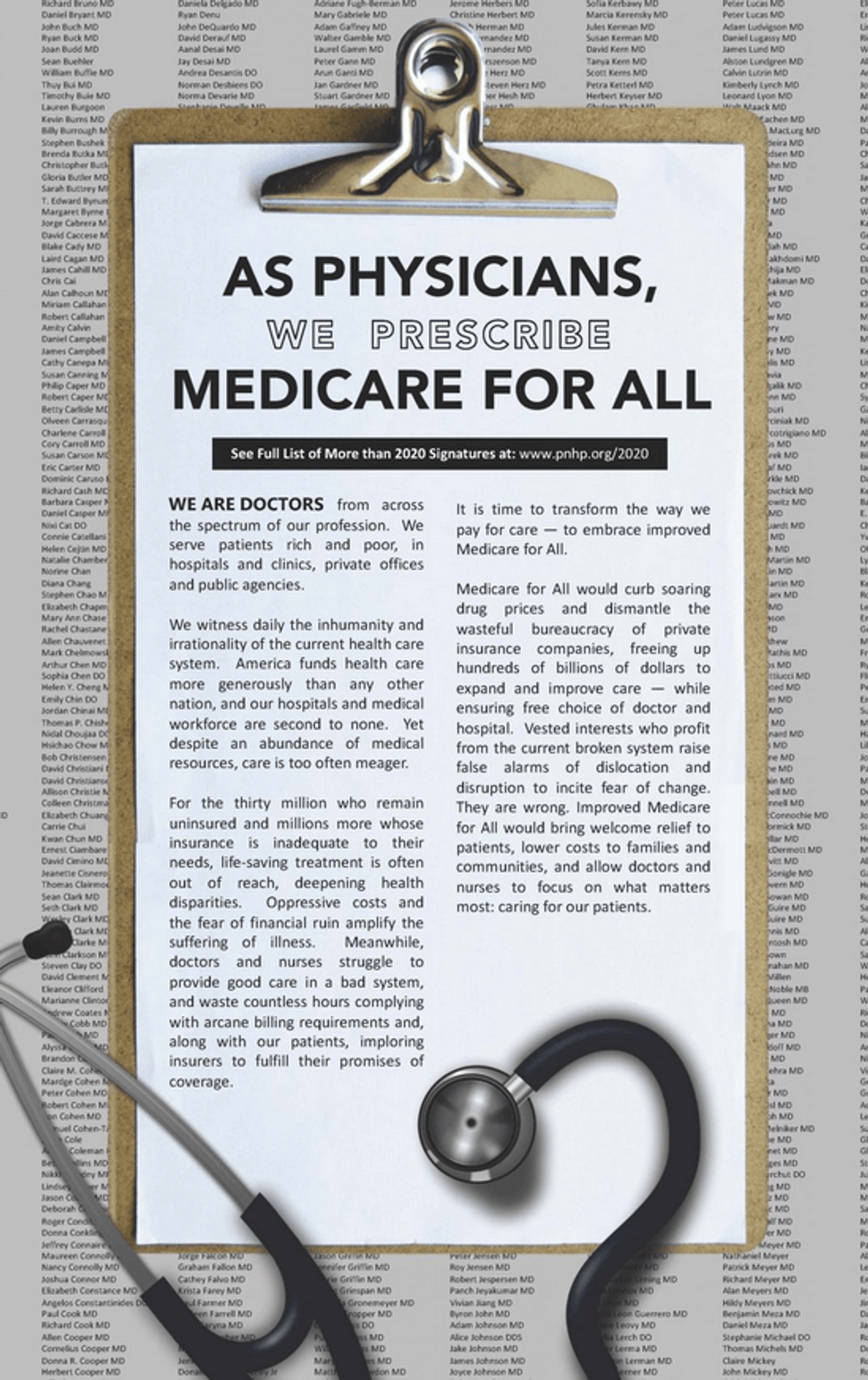 More than 2,000 physicians announced an open letter to the American public, prescribing single-payer Medicare for All, in a full-page ad in the New York Times that will run in the print edition on Tuesday, January 21, 2020. On Monday, in a separate but related move, the American College of Physicians (ACP), a national organization representing 159,000 internists, officially endorsed single-payer Medicare for All reform. The ACP is the largest medical specialty society and second-largest physician group in the country after the American Medical Association (AMA). (Photo: PNHP)