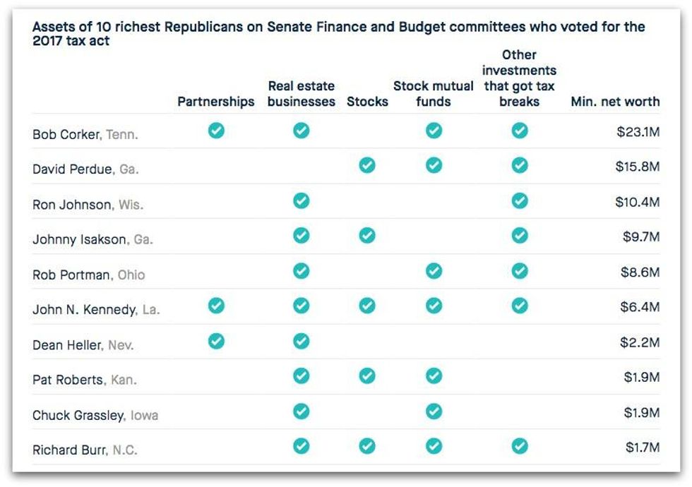 "The 10 richest Republicans in Congress in 2017 who voted for the tax bill held more than $731 million in assets, almost two-thirds of which were in stocks, bonds, mutual funds, and other instruments," Cary added, citing Roll Call's analysis of Congress' wealth.