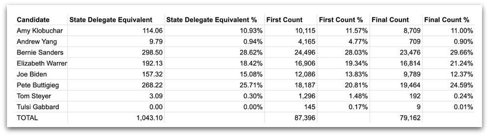 In the second and final count, according to Sanders' partial internal numbers, the Vermont senator bested all his rivals by receiving nearly 30%, while Buttigieg was at approximately 25%, and Warren landed with 21%. Biden ended up in fourth place with 12%, just ahead of fifth-place Sen. Amy Klobuchar who landed with 11%.