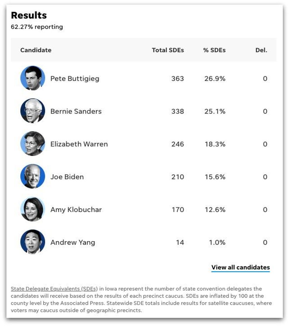 Based on the incomplete tabulations, Sanders received 1,190 more votes than Buttigieg, but due to Iowa's caucus rules, Buttigieg received 25 more state delegates (363 to 338) as certain rural areas are weighted more heavily and allowed him to nibble into Sanders' lead.