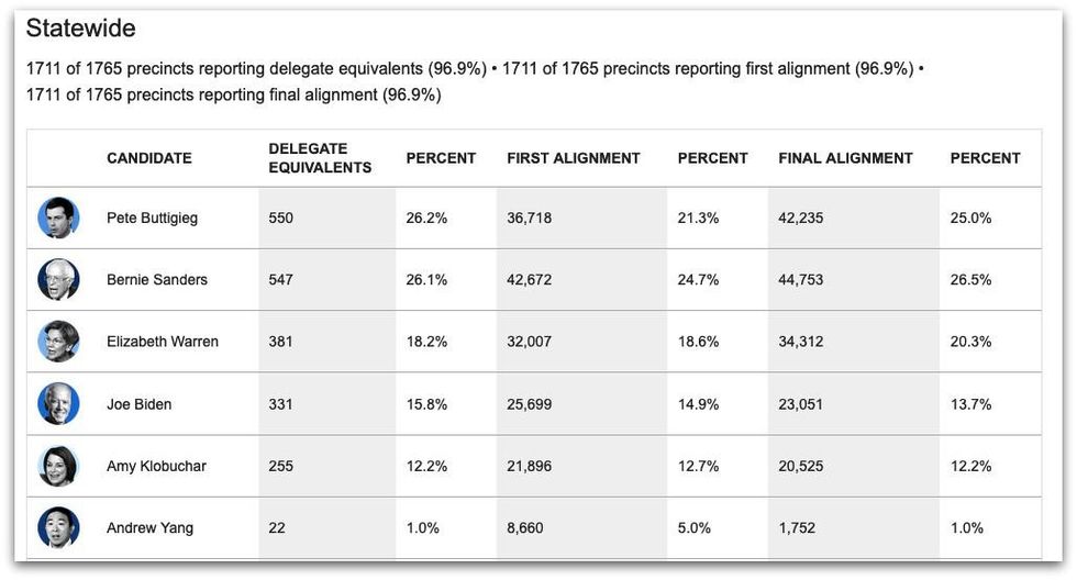 With more than 97% of the precincts now reporting in Iowa, as Common Dreams reported, Sanders--despite many mainstream media outlets and pundits treating Buttigieg as the winner of the contest--extended his popular vote lead in the state to more than 2,500 (44,753 to 42,235). With state delegate equivalents (SDEs), the current totals show Buttigieg now maintains only a three point lead--550 to 547 (one-tenth of a percentage point.) As Politico reported Wednesday, Buttigieg may not have won the Iowa caucus, but "he's crushing the spin game."