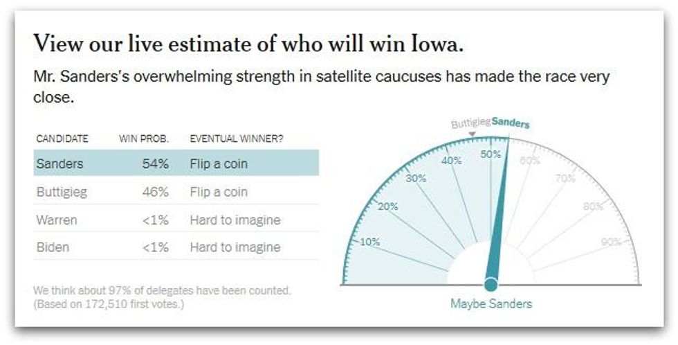 After projecting late Wednesday that Buttigieg would "very likely" emerge victorious from the Iowa debacle, the New York Times drastically changed its prediction following the latest results, giving Sanders a 54% probability of winning the caucus hours after stating such a result was "barely possible."
