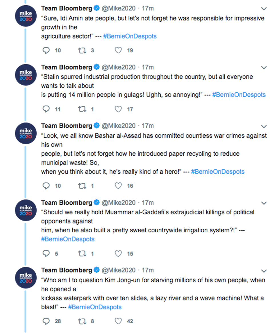 The Bloomberg campaign deleted the tweets and said they were meant to be satirical, but The Guardian reported that some social media users said the campaign had not made clear that the quotes weren't real when they posted them using the hashtag #BernieOnDespots.