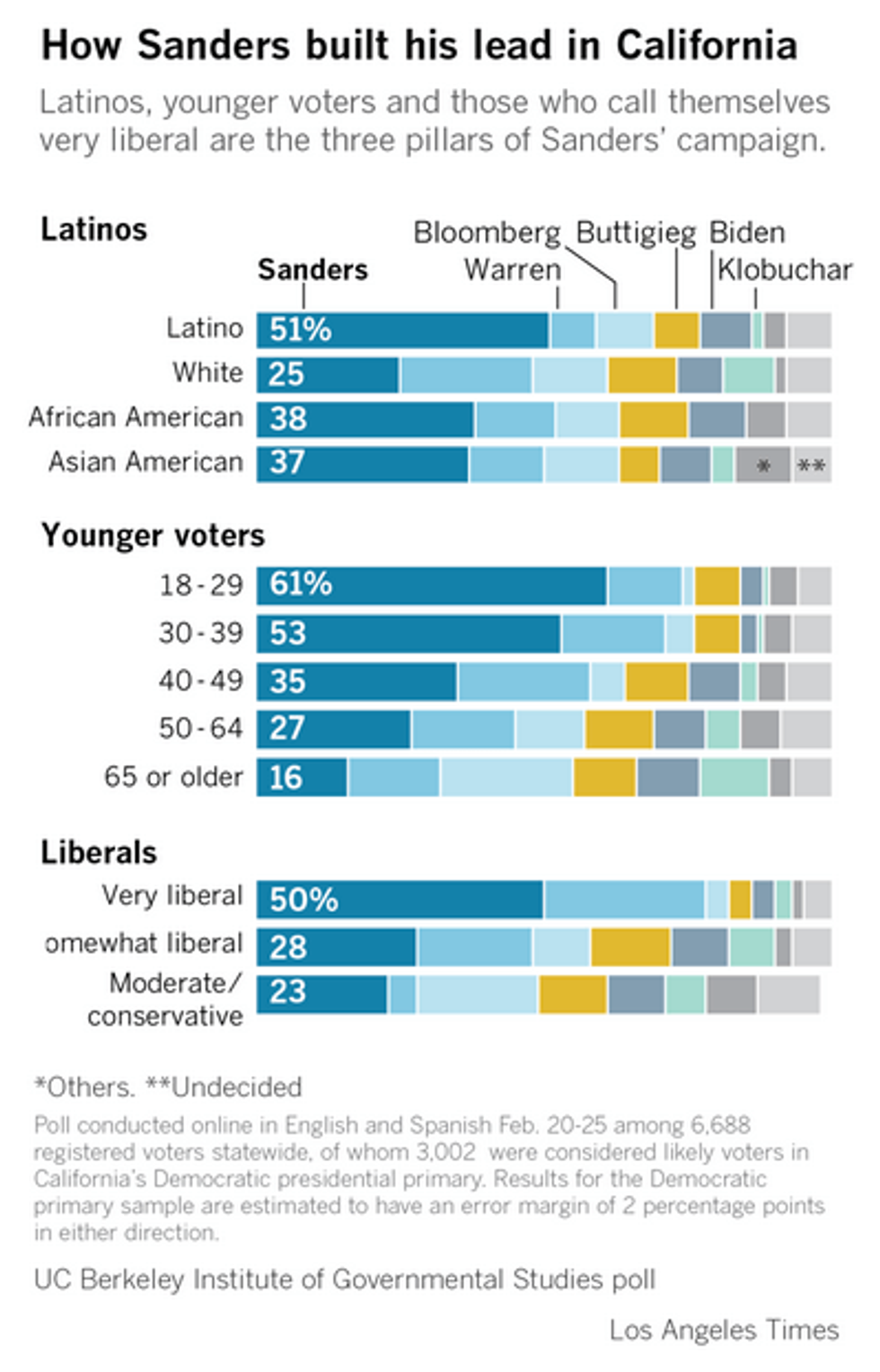 \u201cThe Democratic primary race in California has grown really stark. If this latest poll holds, Sanders would win over 10% of the delegates he needs to clinch the nomination. https://t.co/epLUiNdY3g\u201d— Matt Pearce \ud83e\udd85 (@Matt Pearce \ud83e\udd85) 1582899217