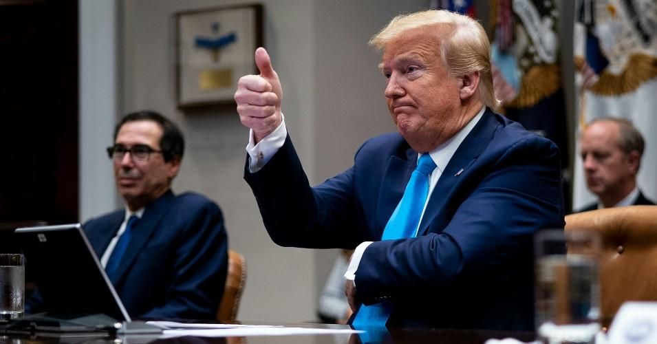 President Donald Trump and Treasury Secretary Steven Mnuchin participate in a video conference with representatives of large banks and credit card companies about more financial assistance for small businesses in the Roosevelt Room at the White House April 7, 2020 in Washington, D.C. (Photo: Doug Mills-Pool/Getty Images)