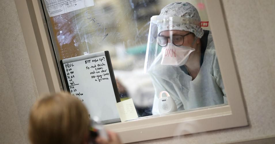 A nurse communicates with a colleague through a window while treating a patient with coronavirus in the intensive care unit at a hospital on May 1, 2020 in Leonardtown, Maryland. (Photo: Win McNamee/Getty Images)