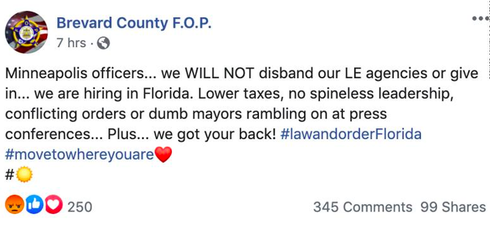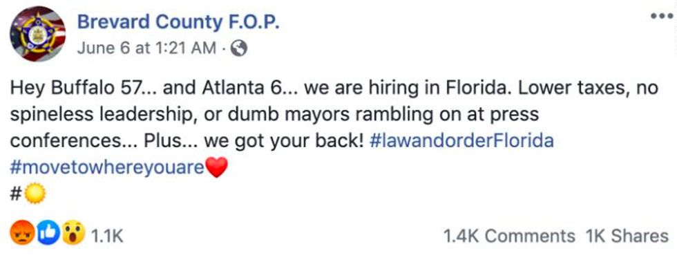 The Brevard County Fraternal Order of Police (FOP) posted two messages on Facebook Saturday urging officers in Buffalo, New York; Atlanta; and Minneapolis to consider finding new jobs in Florida where the union claimed they won't have to face so-called "spineless leadership."