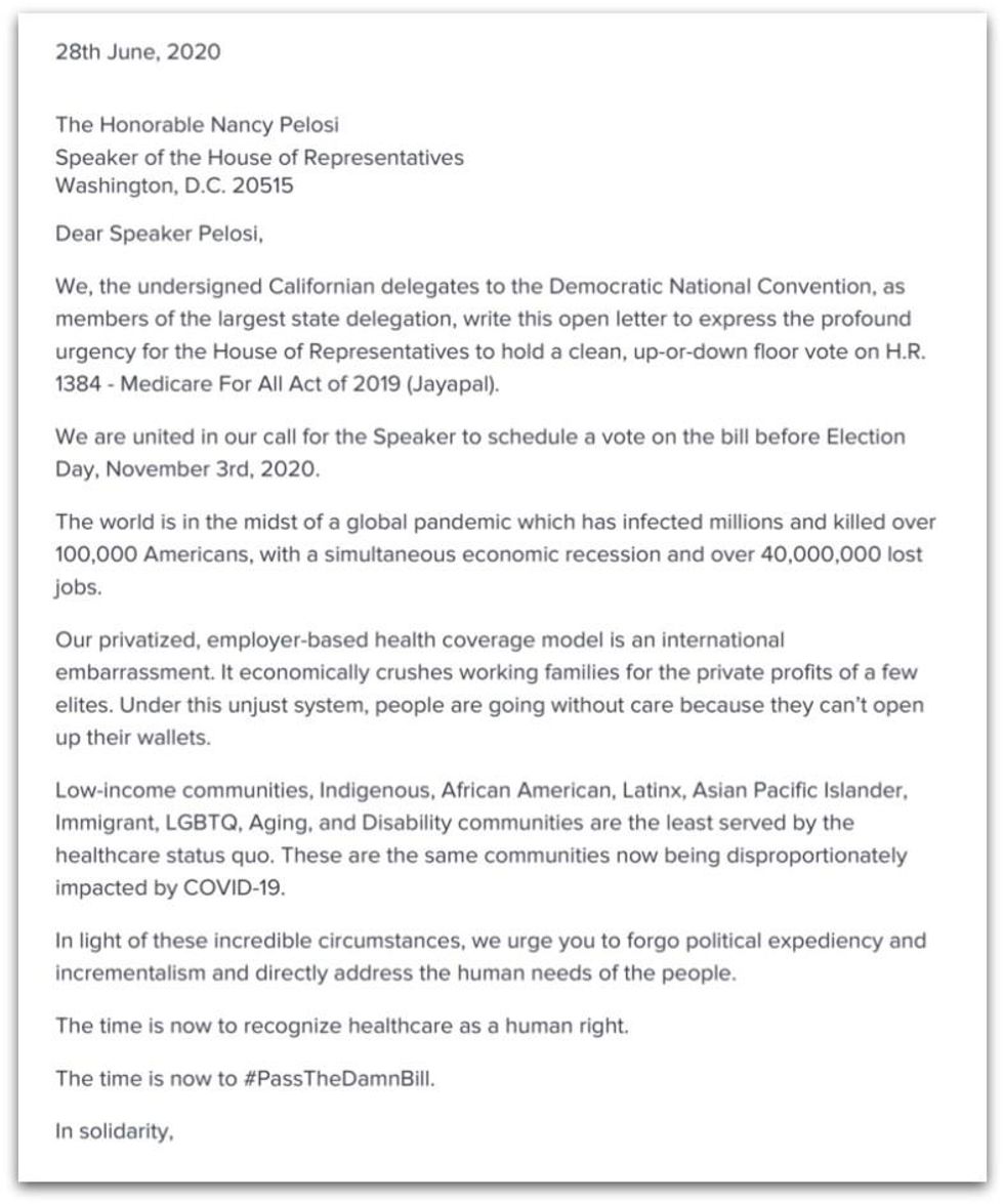 Urging House Speaker Nancy Pelosi to "forego political expediency and incrementalism" in favor of a bold solution to the healthcare crisis exacerbated by the Covid-19 pandemic, 116 delegates elected to represent California at the Democratic National Convention issued an open letter Sunday demanding an up-or-down floor vote on the Medicare for All Act before the November election.