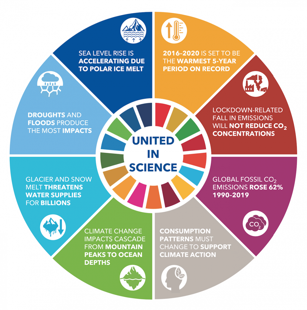 The United in Science 2020 Report (pdf) is the product of a joint effort led by U.N. Secretary-General Antonio Guterres to aggregate the latest updates on climate science. A group of six global partner organizations contributed chapters that provide a comprehensive evaluation of our Earth system.
