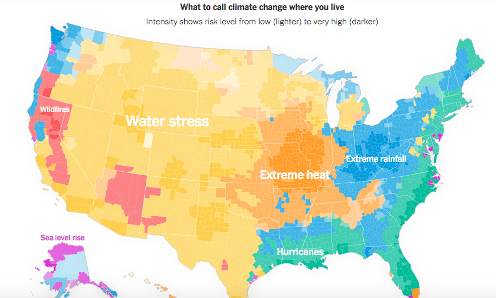 Taking a cue from Washington Gov. Jay Inslee, an outspoken climate action advocate who this week referred to the wildfires which have burned through hundreds of thousands of acres in his state as "climate fires," two New York Times journalists on Friday offered a visual of how the climate crisis is expected to affect every part of the United States.