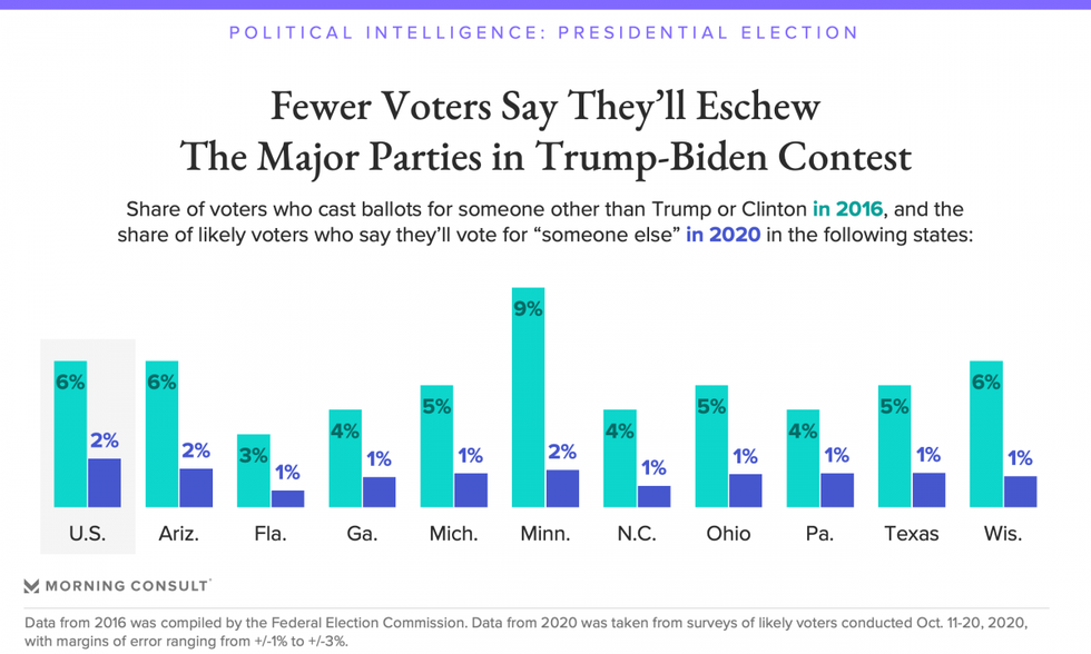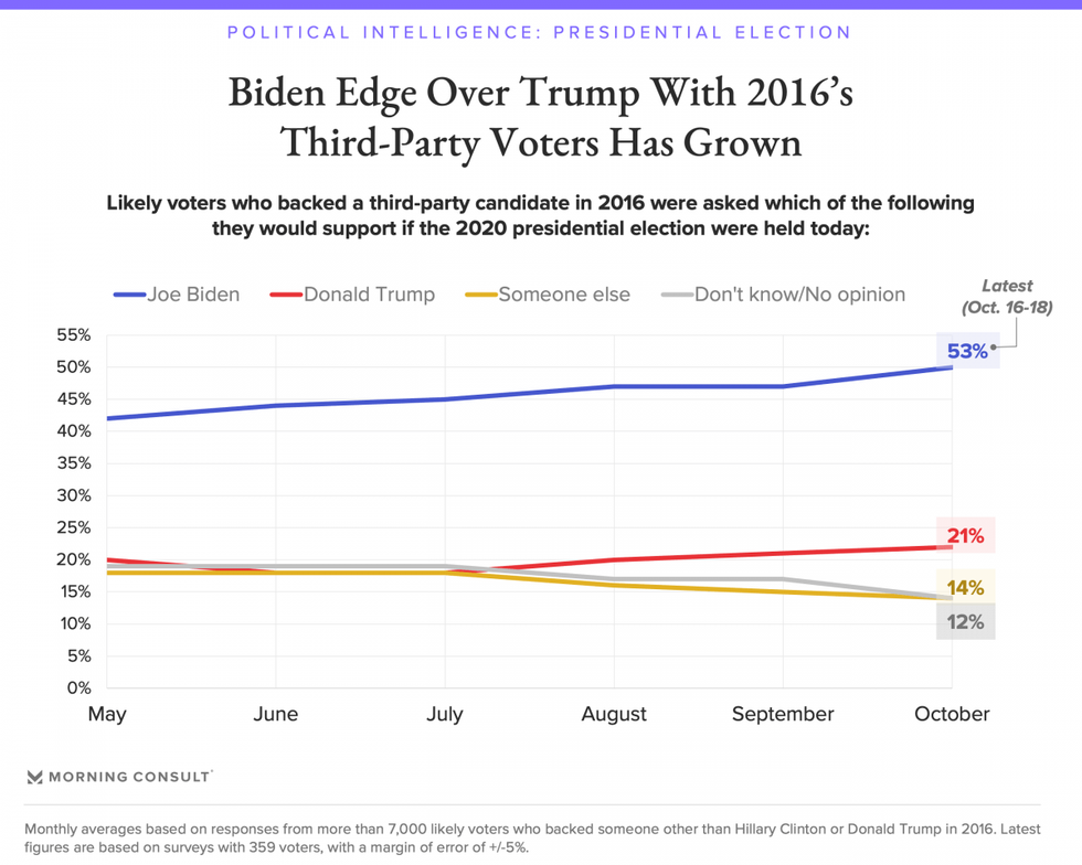 Between October 16-18, Morning Consult Political Intelligence surveyed 359 likely voters who opted for candidates other than Trump or Hillary Clinton in 2016 and found that 53% are supporting Biden in this year's election, while just 21% are backing Trump.