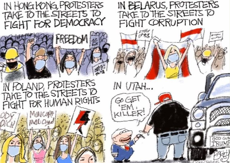 Tribune cartoonist Pat Bagley quipped that "Utah legislators are considering a bill that would let drivers off the hook for mowing down protesters."