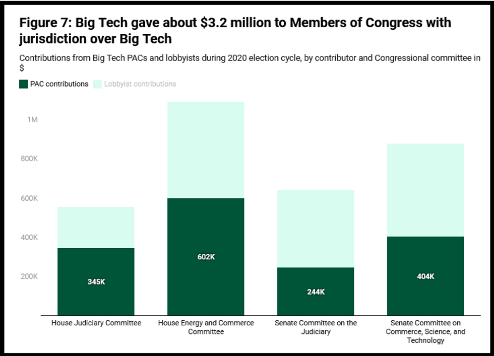 Using campaign finance data from the Center for Responsive Politics, the report shows that Big Tech companies have donated to 94% of members of Congress who serve on House and Senate committees with jurisdiction over the industry.