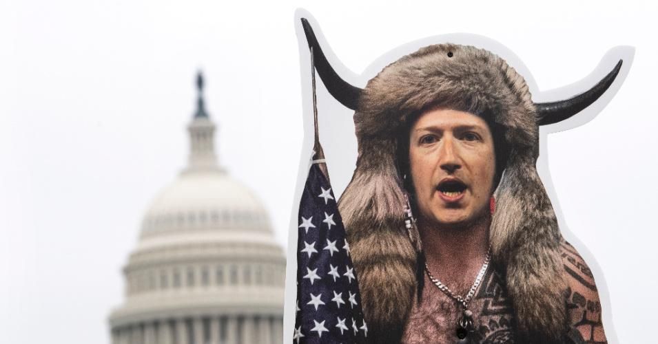 A cardboard cutout of Mark Zuckerberg, CEO of Facebook, dressed up as the QAnon Shaman on Thursday, March 25, 2021. (Photo: Caroline Brehman/CQ-Roll Call, Inc via Getty Images)