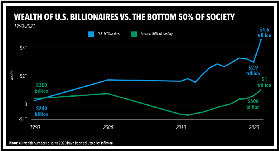 After seeing their fortunes surge during the deadly coronavirus pandemic, America's 719 billionaires are now collectively worth $4.56 trillion--making them over four times wealthier than the roughly 165 million people in the bottom half of U.S. society combined, according to a new analysis by the Institute for Policy Studies and Americans for Tax Fairness.