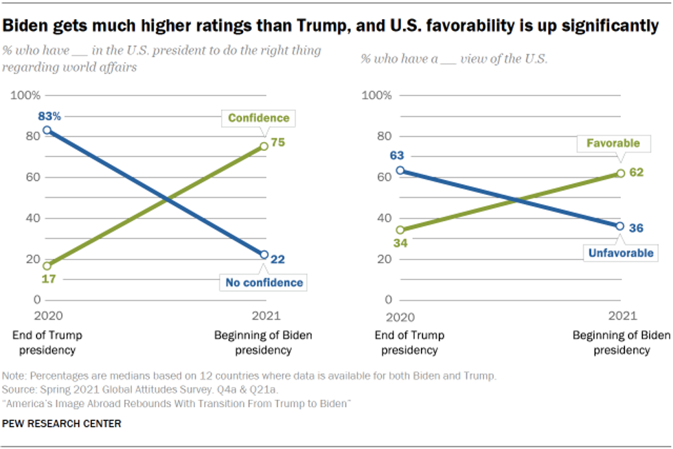 Stark contrasts were revealed in a survey of a dozen nations this year and last. At the end of Trump's presidency, a median of just 17% had confidence in him to do the right thing regarding world affairs. At the start of President Joe Biden's term in 2021, however, 75% expressed such confidence. And while a median of only 34% had a favorable view of the U.S. at the end of Trump's presidency, 62% had a favorable view at the start of Biden's presidency.