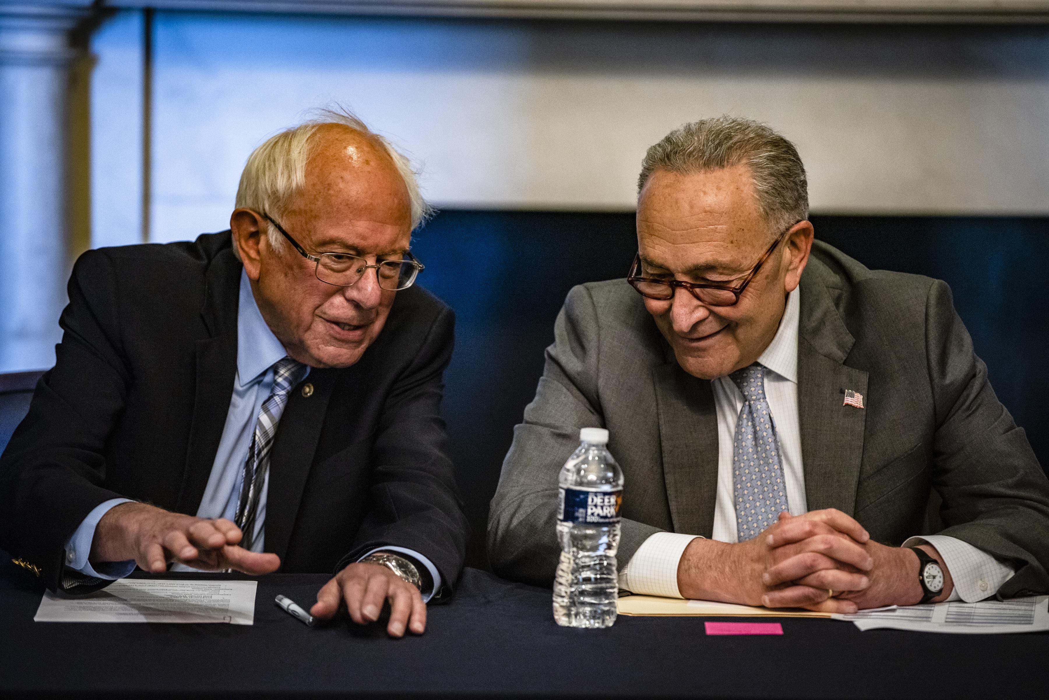 Senate Majority Leader Chuck Schumer (D-N.Y.) and Budget Committee Chairman Bernie Sanders (I-Vt.) hold a meeting in the Mansfield Room at the U.S. Capitol building on June 16, 2021 in Washington, D.C. (Photo: Samuel Corum/Getty Images)