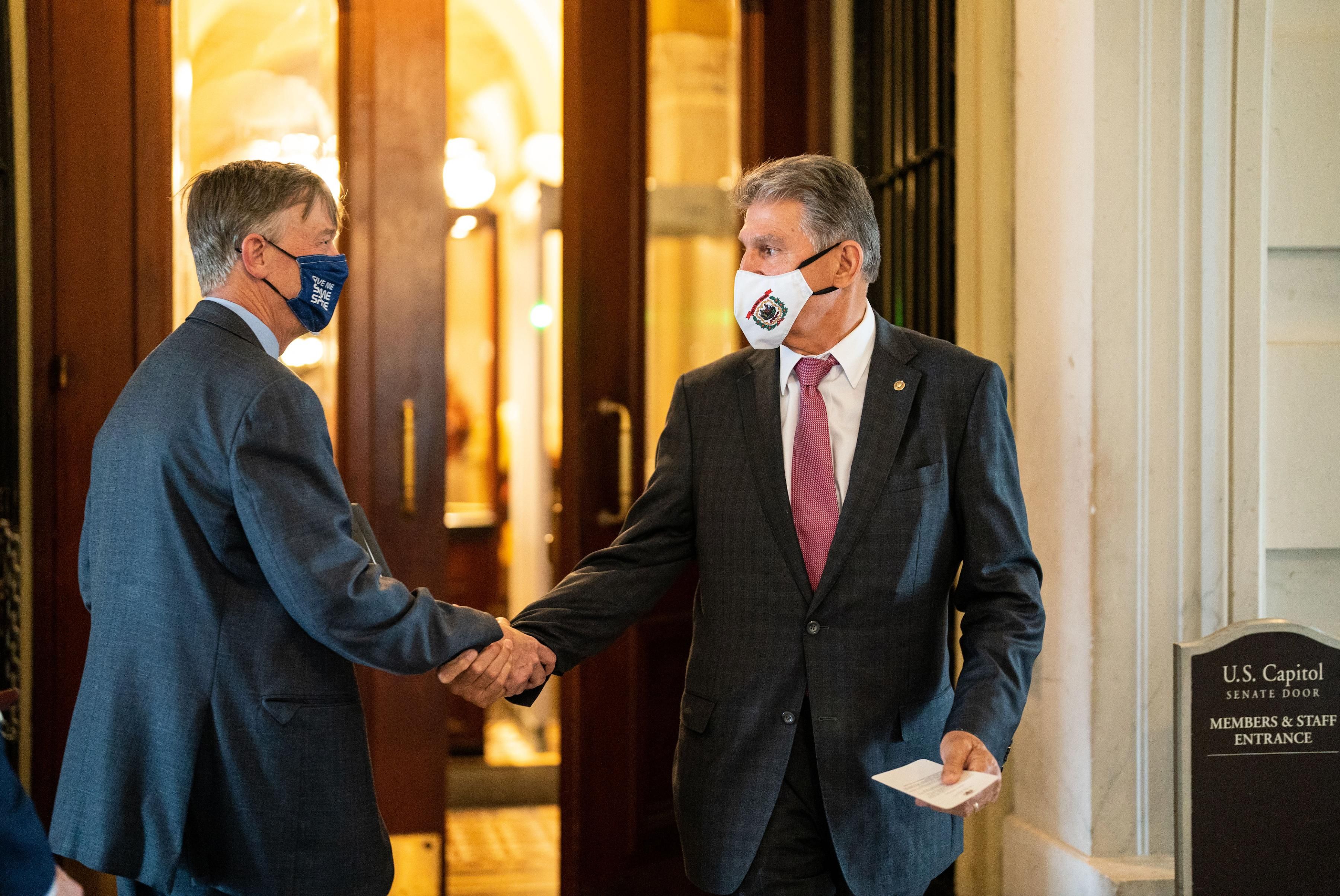 Democratic U.S. Sens. John Hickenlooper of Colorado (left) and Joe Manchin of West Virginia (right)—whose households own millions of dollars in combined fossil fuel assets—shake hands in the United States Senate on September 28, 2021. (Photo: Kent Nishimura/Los Angeles Times via Getty Images)