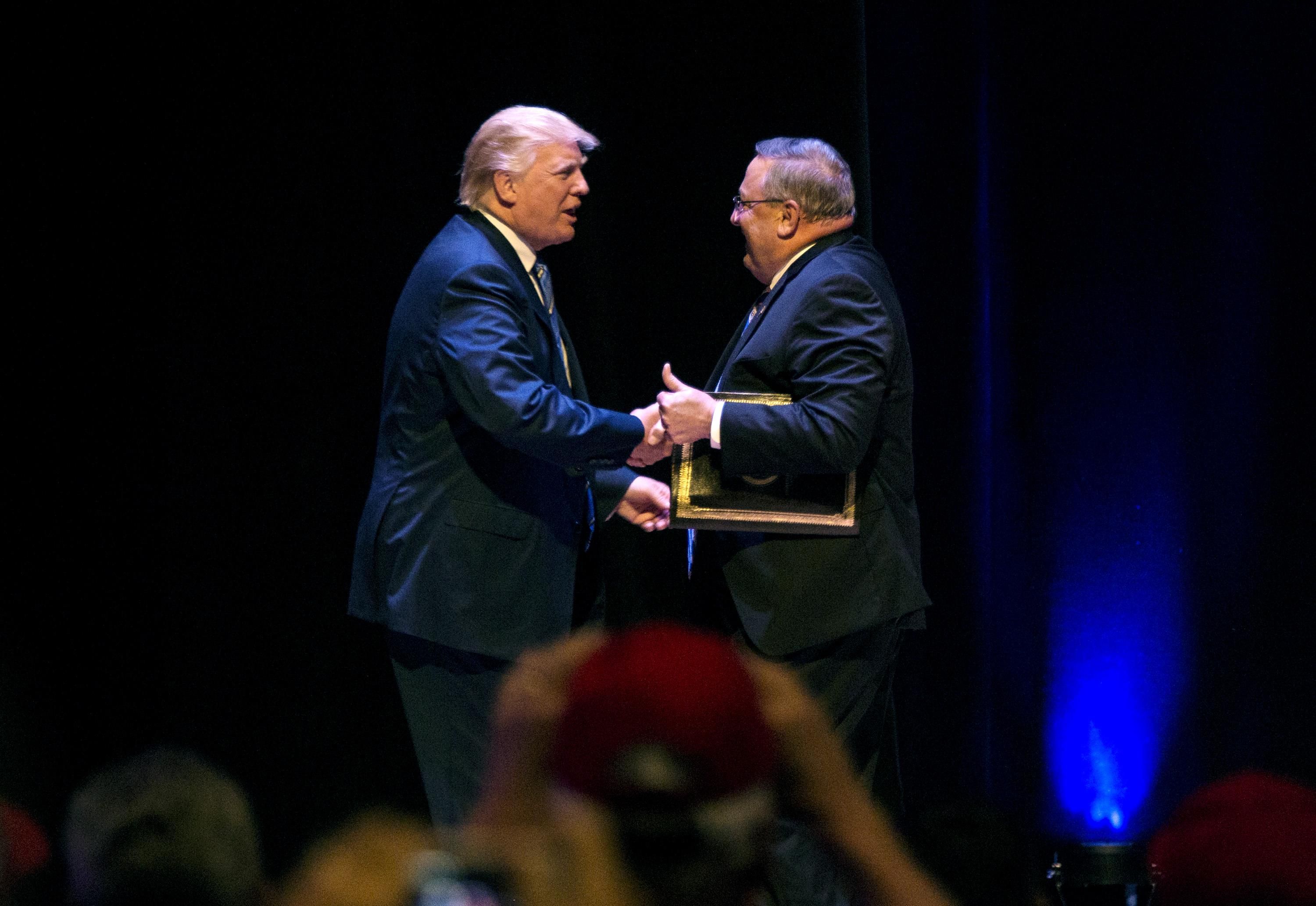 Then-presidential candidate Donald Trump shakes hands with Maine Gov. Paul LePage at a rally in Portland, Maine on Thursday, August 4, 2016. (Photo: Derek Davis/Portland Portland Press Herald via Getty Images)