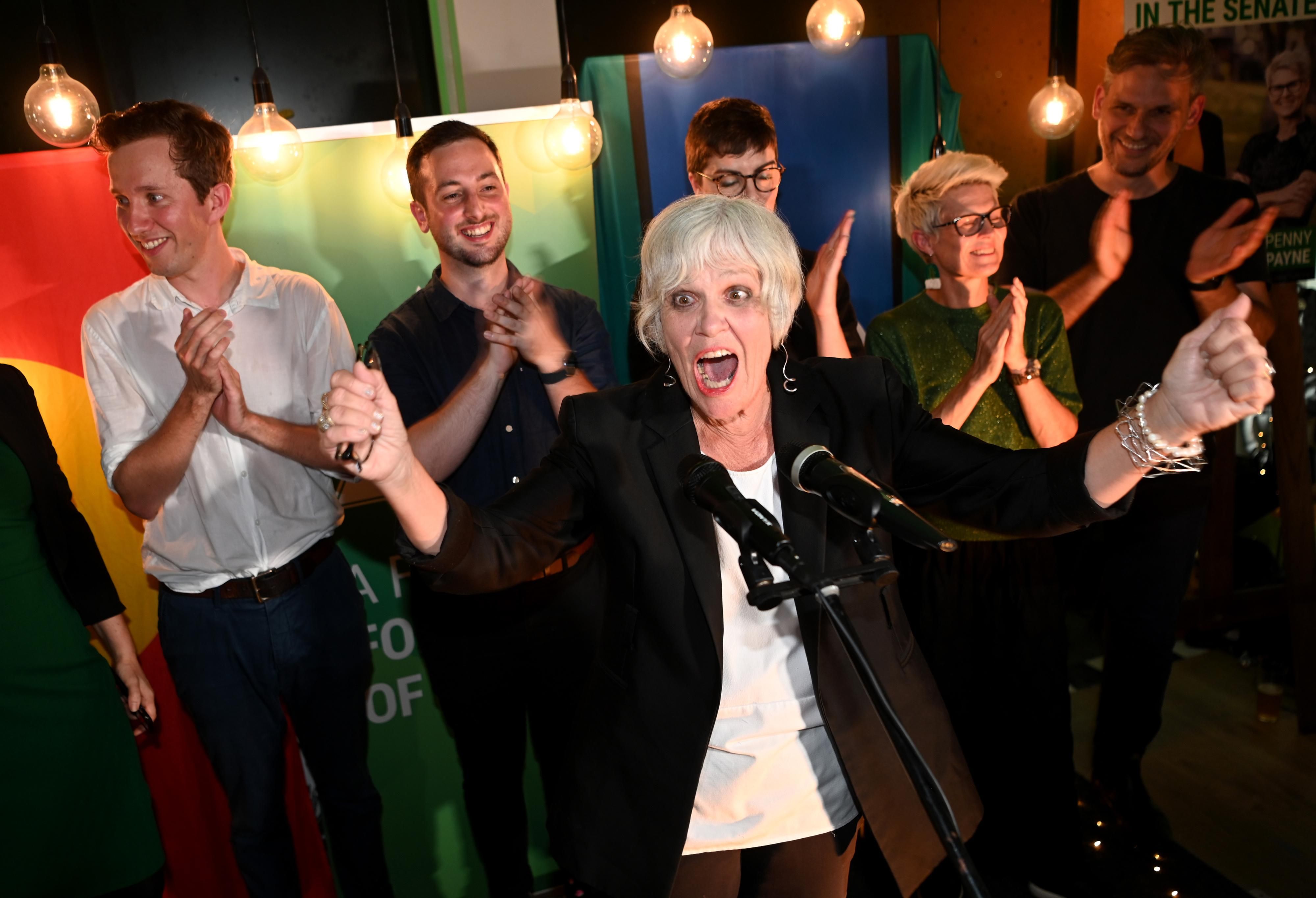 Australian Greens candidate Elizabeth Watson-Brown celebrates winning the Queensland parliamentary seat of Ryan—which was held by a conservative coalition for 50 years—in Brisbane on May 21, 2022. (Photo: Dan Peled/Getty Images)