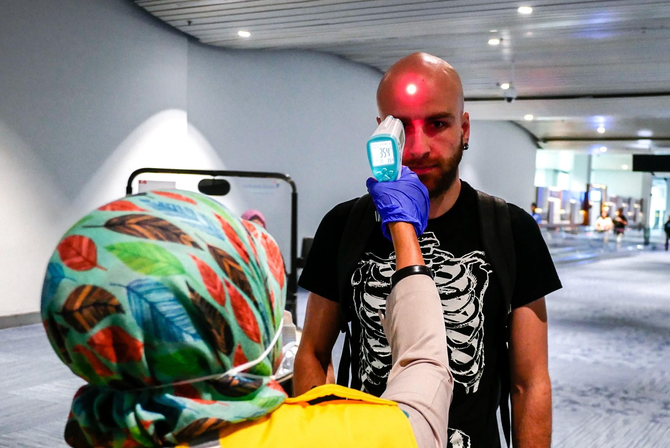 A traveler entering Indonesia undergoes monkeypox screening at Soekarno-Hatta International Airport in Tangerang near Jakarta on May 15, 2019. (Photo: Anton Raharjo/Anadolu Agency/via Getty Images)