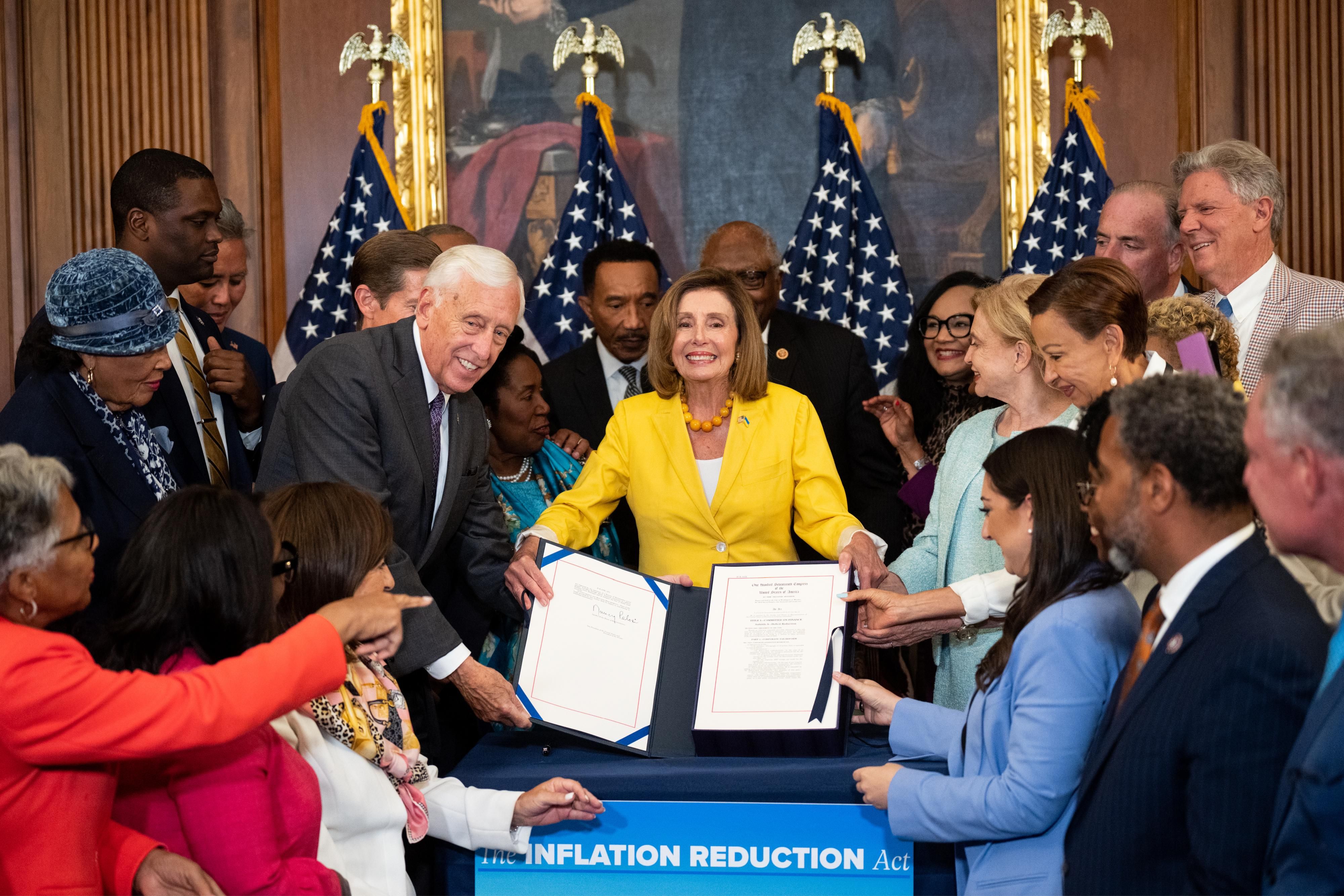 House Speaker Nancy Pelosi (D-Calif.) and House Majority Leader Steny Hoyer (D-Md.) hold up the Inflation Reduction Act bill during an August 12, 2022 enrollment ceremony at the U.S. Capitol in Washington, D.C. (Photo: Bill Clark/CQ-Roll Call, Inc. via Getty Images)