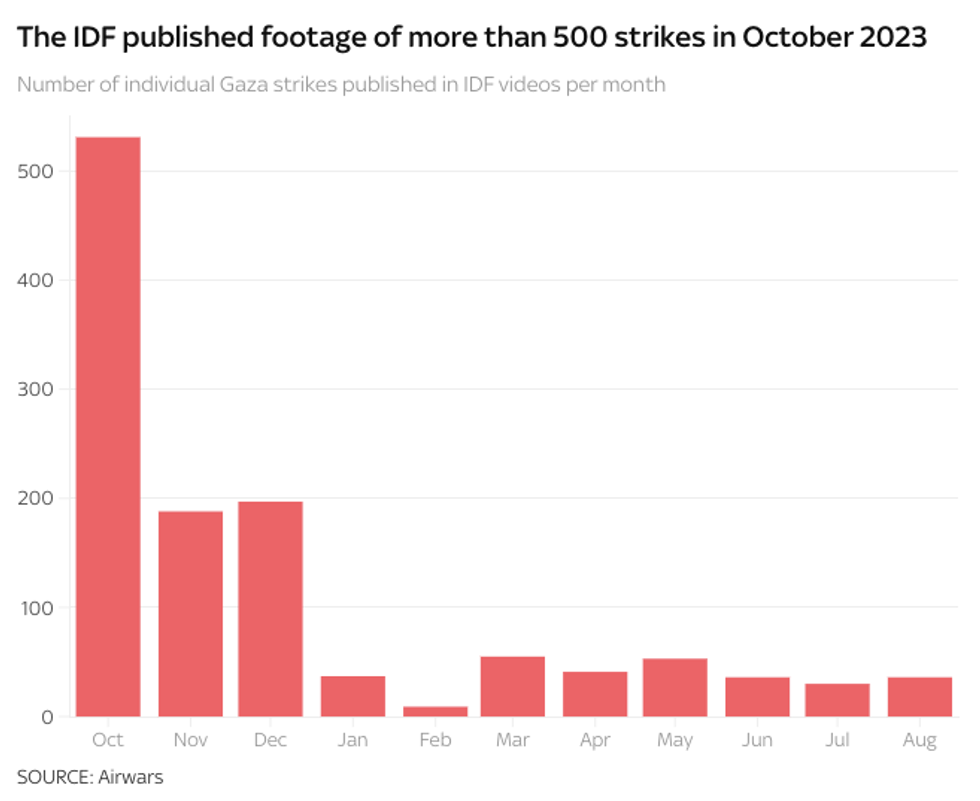 The Israel Defense Forces (IDF) posted videos of 1,219 strikes between October 7, 2023 and August 31—the period studied—nearly half of which came from the first month of the war. The IDF often overlays captions citing Hamas targets. Most of the videos are grainy, with people on the ground not visible, deaths not directly evident, and locations unclear.
