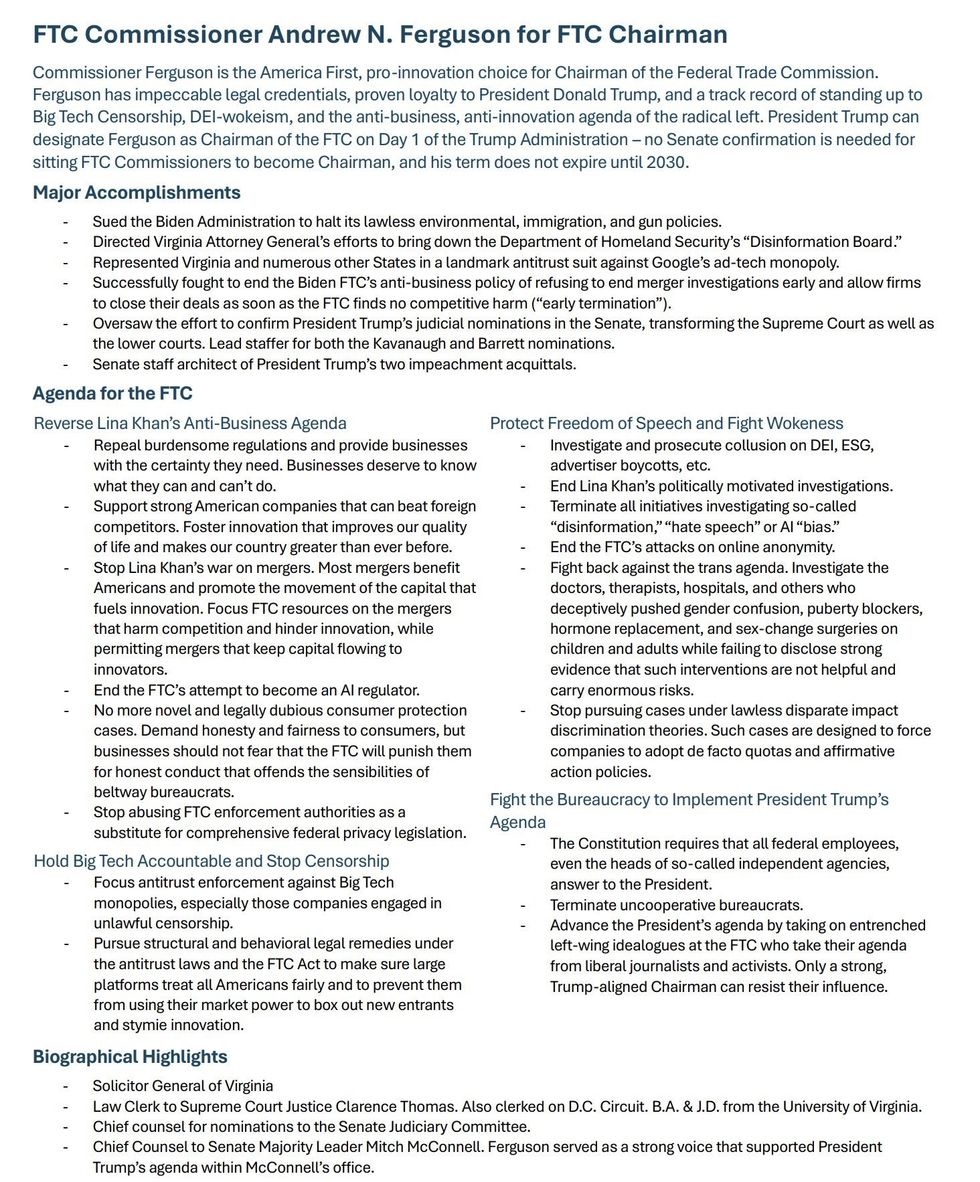Ferguson's top agenda priority, according to the document, is to "reverse Lina Khan's anti-business agenda" by rolling back "burdensome regulations," stopping her "war on mergers," halting the agency's "attempt to become an AI regulator," and ditching "novel and legally dubious consumer protection cases."