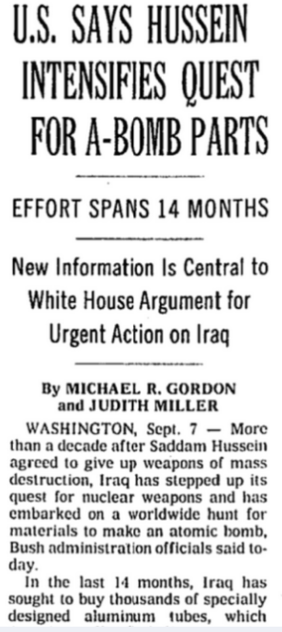 In 2014, Margaret Sullivan, then the Times' public editor, wrote that "the lead-up to the war in Iraq in 2003 was not the Times' finest hour."