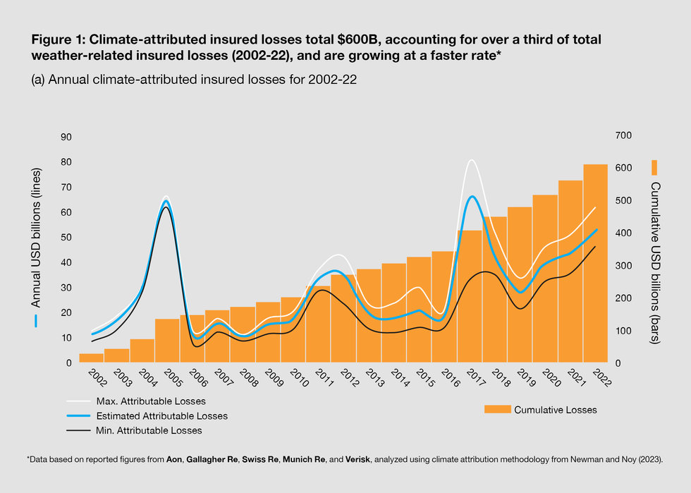 While climate-attributed losses from 2002 to 2022 worked out to around $30 billion annually, the financial burden was not evenly spread out over those 20 years. Instead, the report says, such losses "have recently accounted for a growing share of insured weather losses, showing how decarbonization is crucial to contain soaring insurance costs."