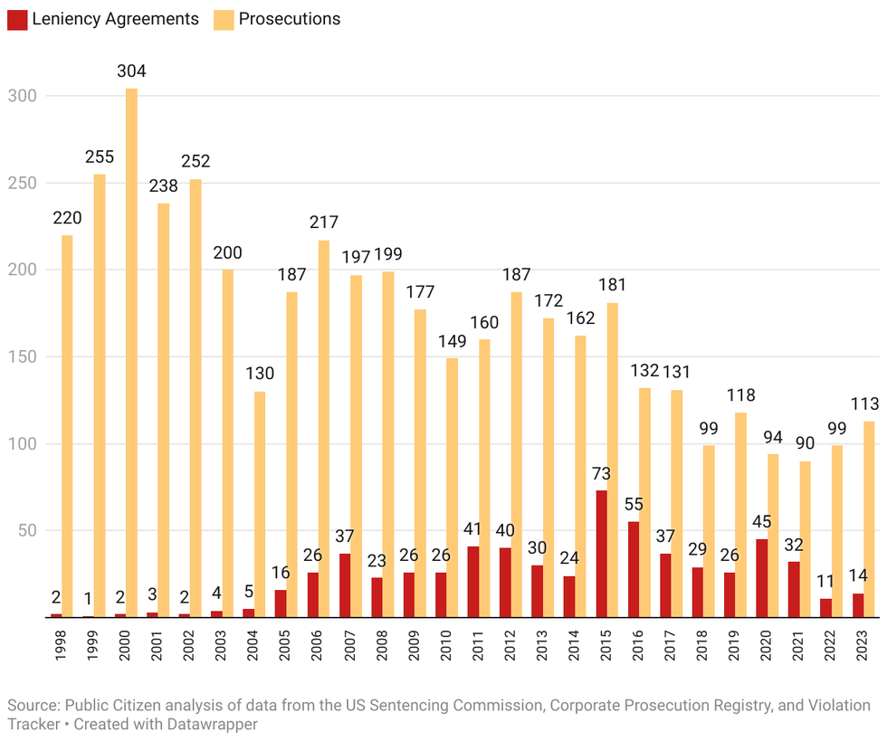 "Prosecutions remain far too few, and the ongoing overuse of leniency deals for big corporations that break the law continues to undermine deterrence."
