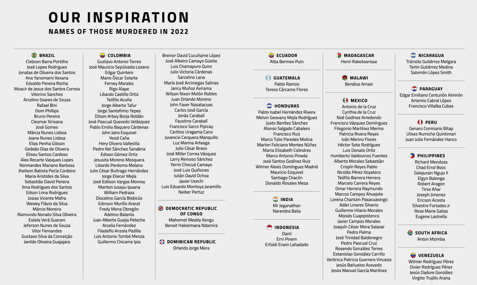 The group published the names of those known to have been killed in 2022 in a report titled Standing Firm, while acknowledging that the "names of many defenders who were killed last year may be missing, and we may never know how many more gave their lives to protect our planet."